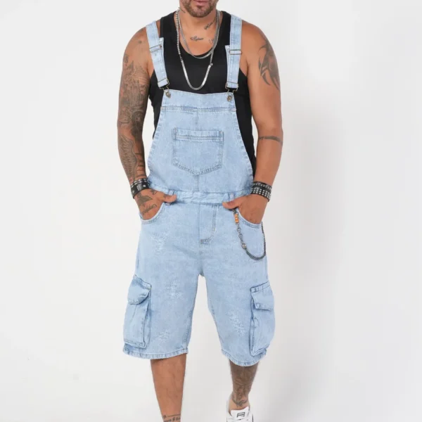 Overol Denim Gris Lavado con Detalles Desgastados y Accesorios